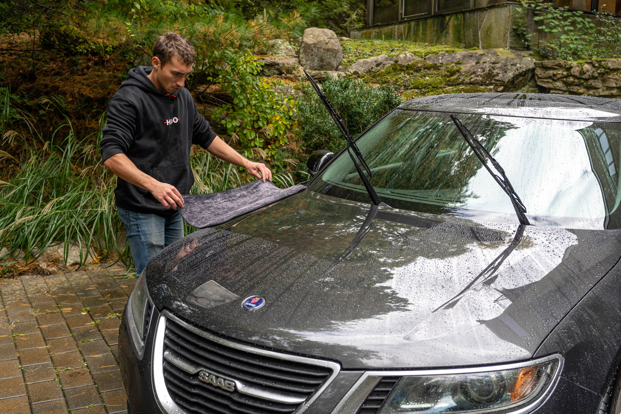 Drying a vehicle with drying aid. Drying aids contain a cationic surfactant blend along with hydrophobic materials. Cationic surfactant blends attach the hydrophobic material to the car's surface, where it repels water and light debris such as dust, pollen and minor dirt. Drying aids break the surface tension on the vehicle, thus reducing the risk of scratching.